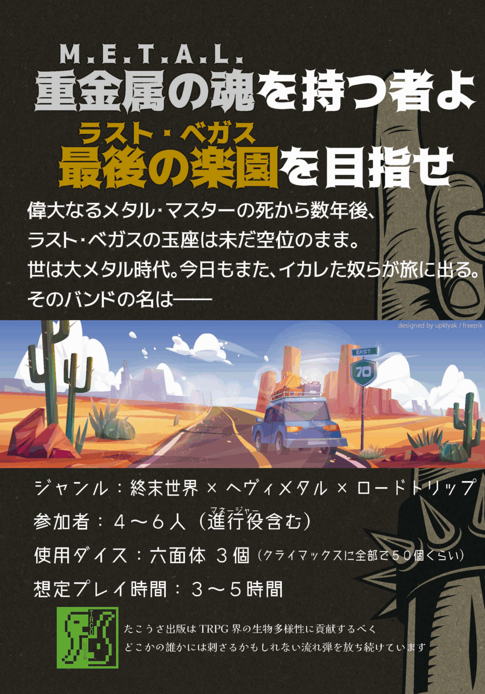 鋼の魂を持つメタラーとなり、己のドリームを叶えるために最終戦争後の荒野を旅するポストアポカリプティックバンドツアーTRPG。