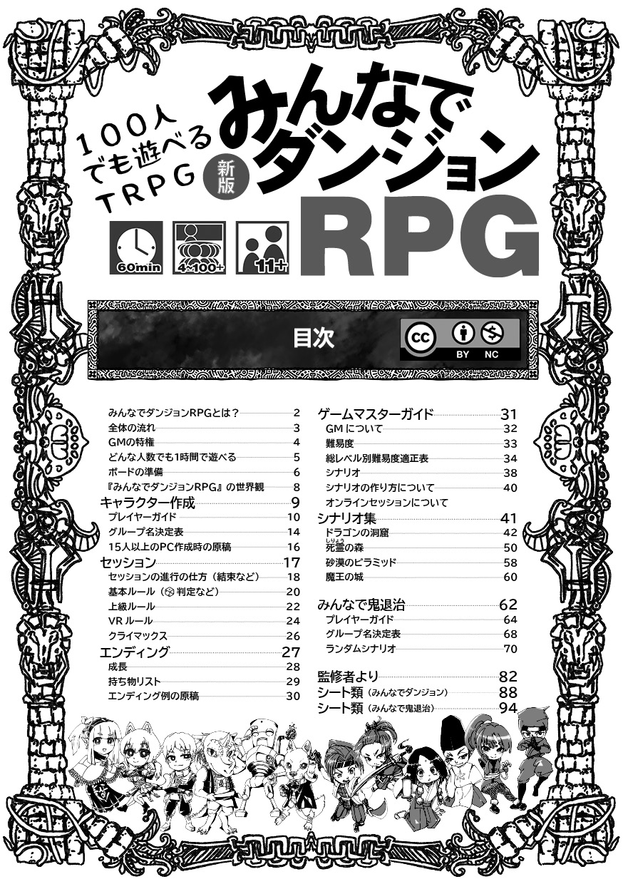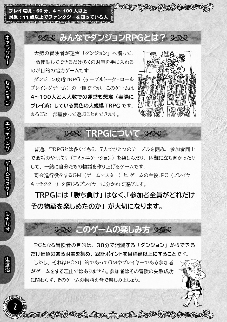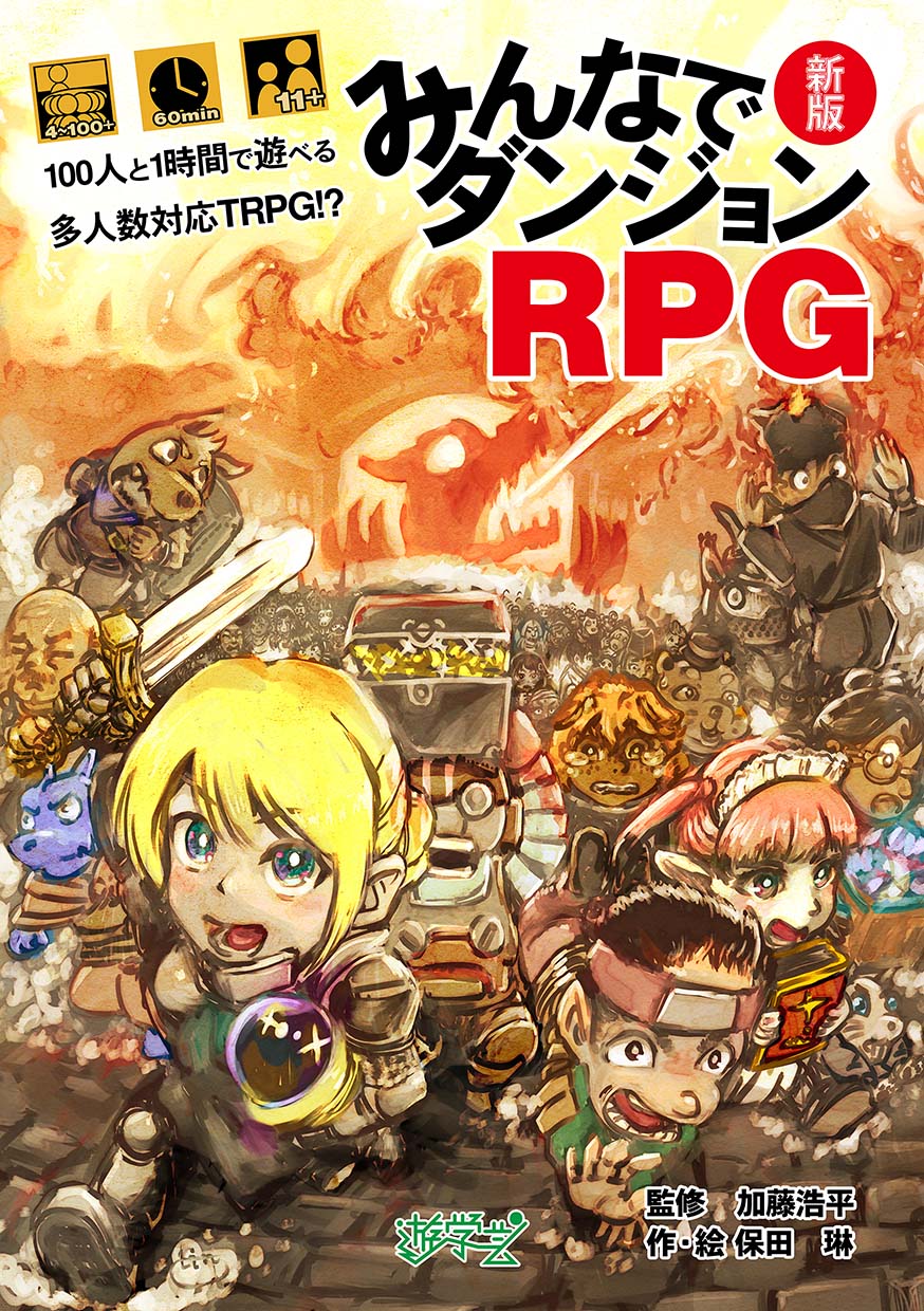 『みんなでダンジョンRPG』とは、4~100人がキャラ作込み1時間で遊べるTRPG(テーブルトーク・ロールプレイングゲーム)です。
