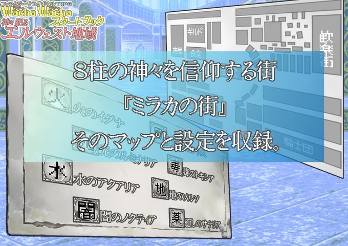 地域の設定として8柱の神々を信仰する街『ミラカの街』のマップと設定、そして『エルウェスト地域』の設定も収録。